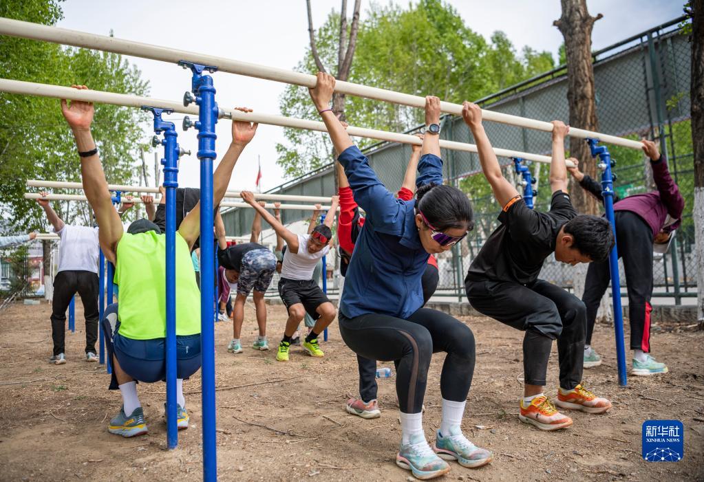 在西藏自治區(qū)體育運動技術(shù)學(xué)校,玉珍拉姆(前排左一)在訓(xùn)練后拉伸(4月29日攝)。新華社記者 孫非 攝