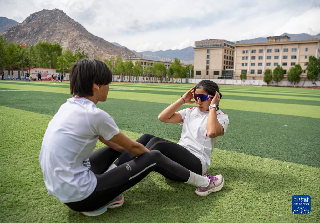 在西藏自治區(qū)體育運動技術(shù)學(xué)校,玉珍拉姆(右)在訓(xùn)練中做仰臥起坐(4月29日攝)。新華社記者 孫非 攝