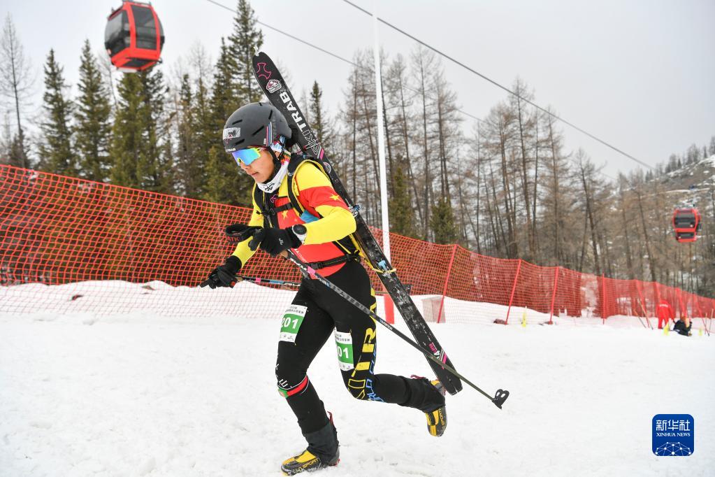 在新疆富蘊縣可可托海國際滑雪度假區(qū),玉珍拉姆參加全國首屆滑雪登山冠軍賽短距離(女子組)比賽(4月8日攝)。新華社記者 胡虎虎 攝