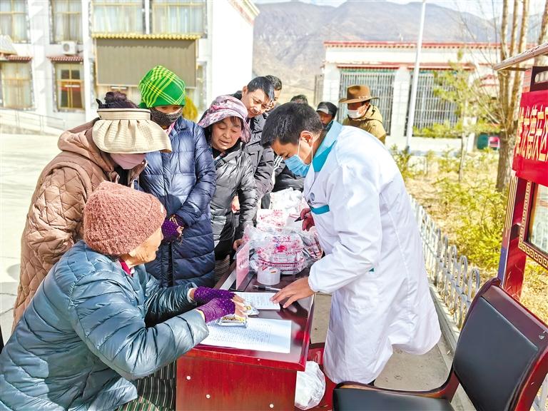 近日,拉薩市堆龍德慶區(qū)婦聯(lián)在包村點(diǎn)古榮鎮(zhèn)加入村開(kāi)展送醫(yī)送藥送健康活動(dòng),邀請(qǐng)西藏雄巴拉曲神水藏藥有限公司醫(yī)務(wù)人員為群眾進(jìn)行義診。 圖為義診現(xiàn)場(chǎng)。記者 拉巴桑姆 攝