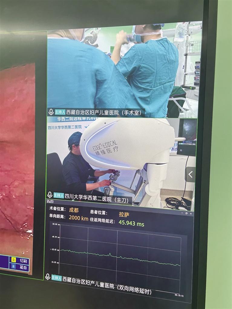 梅玲介紹,此次手術(shù)是與四川大學(xué)華西第二醫(yī)院聯(lián)合開展的,由四川大學(xué)華西第二醫(yī)院的鄭瑩教授團(tuán)隊(duì)主刀,并依托華西的先進(jìn)技術(shù)平臺(tái),通過遠(yuǎn)程方式完成手術(shù)。手術(shù)結(jié)束后,鄭瑩教授通過視頻向大家介紹,這場(chǎng)跨越2000公里距離與3000米海拔差異的手術(shù),總共用時(shí)1小時(shí)45分鐘,網(wǎng)絡(luò)延遲僅40毫秒?!按舜问中g(shù)的成功為今后更多優(yōu)質(zhì)資源技術(shù)送達(dá)偏遠(yuǎn)地區(qū)提供了重要參考,也為提高西藏醫(yī)療水平打下了堅(jiān)實(shí)的基礎(chǔ)?!编崿撜f。