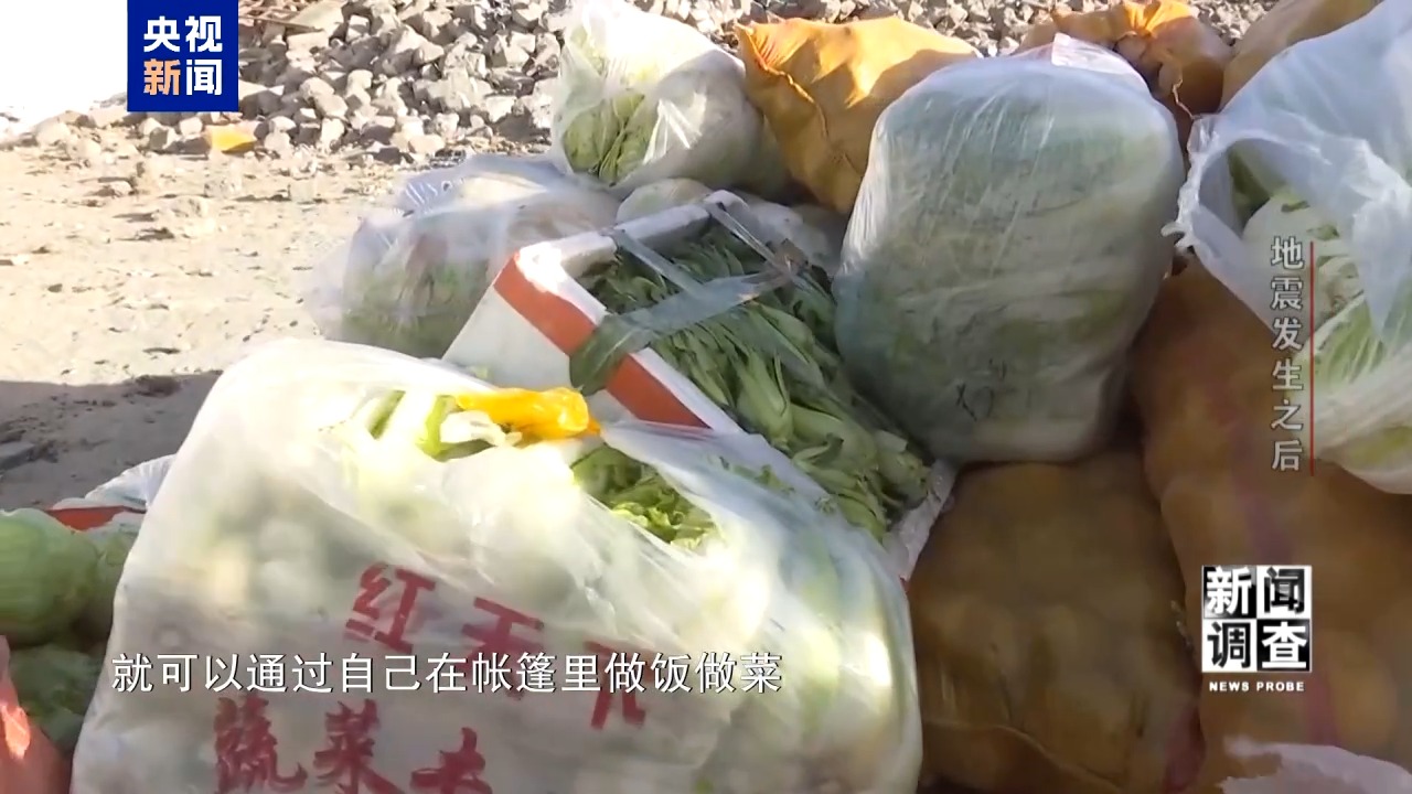 總臺(tái)央視記者 張騰飛:還有一點(diǎn)讓我們很意外的是,今天這里出現(xiàn)了新鮮的蔬菜,有大白菜、胡蘿卜。剛才我們告訴大家,隨著暖爐放進(jìn)各個(gè)帳篷,既可以取暖又可以燒水做飯。還有非常新鮮的青菜,那么未來(lái)我們的老百姓就可以自己在帳篷里做飯做菜。最后再給大家看的,也是讓我很意外的,在震區(qū)看到大量零食,有這樣的膨化食品、瓜子,包括小朋友可能會(huì)喜歡的潤(rùn)喉糖。這里的物資保障的速度,超出了我此前的想象。