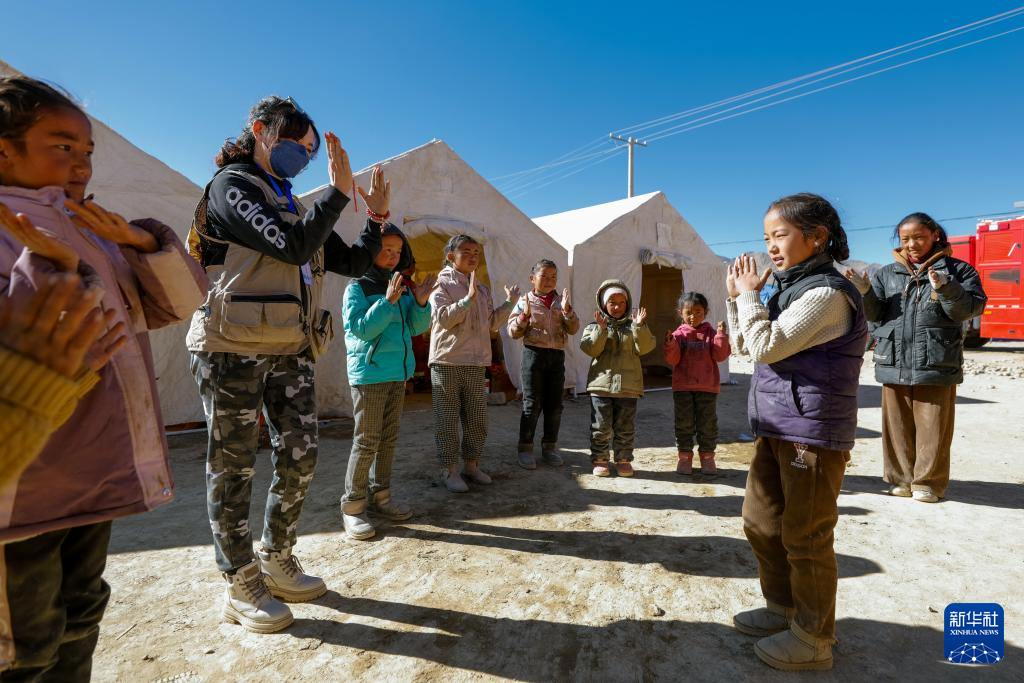 1月11日,在定日縣曲洛鄉(xiāng)措昂村的受災(zāi)群眾安置點(diǎn),譚惜仁(中)帶著孩子們玩“跳房子”游戲。新華社記者 沈伯韓 攝 ??