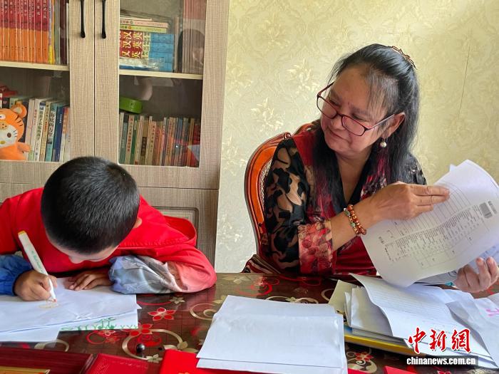 圖為格桑卓瑪看著孩子畫(huà)畫(huà)。趙朗 攝