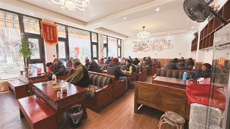 老人們正在社區(qū)驛站喝茶、聊天。圖/記者 余書(shū)冉