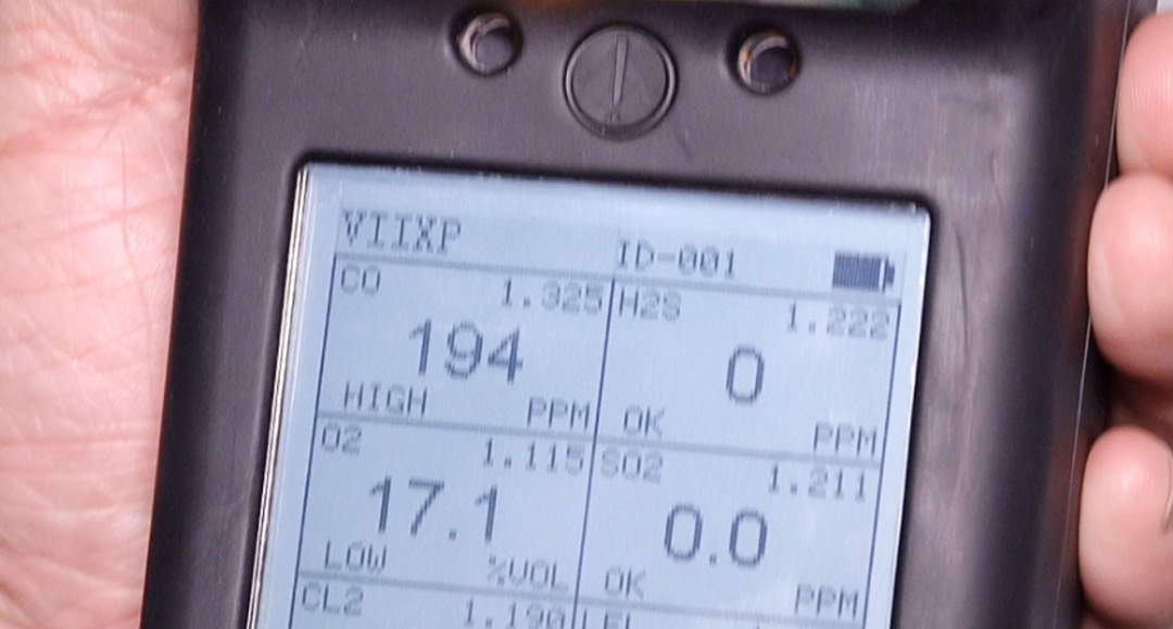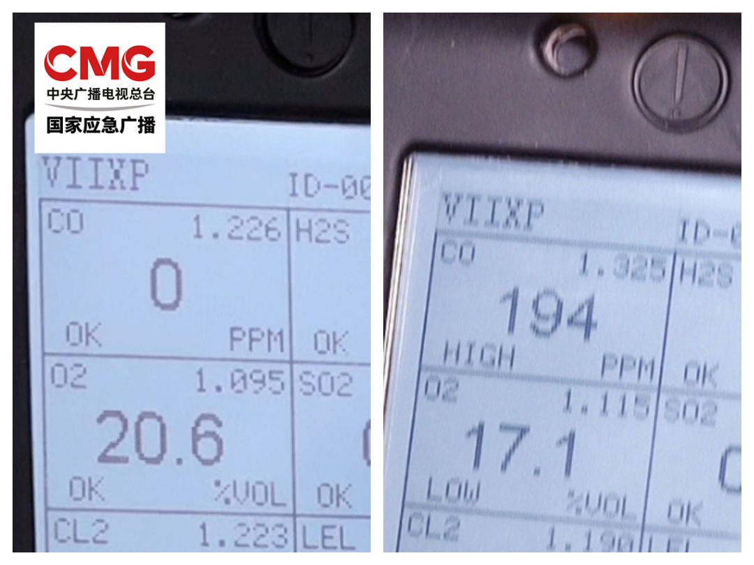 左圖為實驗前室內(nèi)氣體數(shù)值,右圖為關(guān)閉門窗、打開油煙機幾分鐘后的氣體數(shù)值。一氧化碳含量由0ppm上升至194ppm(70ppm為高報警數(shù)值);氧氣含量由實驗開始前的20.6%Vol下降至17.1%Vol以下(19.5%Vol為儀器低報警數(shù)值)。