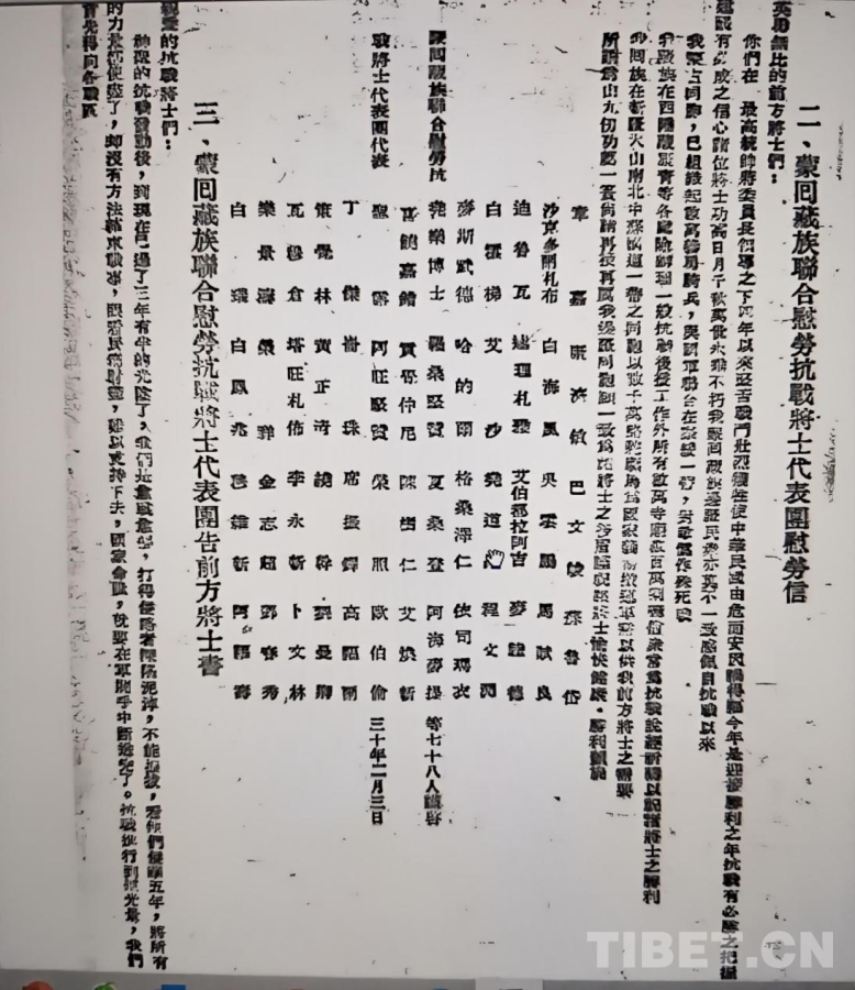 圖為《蒙回藏族聯(lián)合慰勞抗戰(zhàn)將士代表團(tuán)告前方將士書》(喜饒尼瑪供圖)