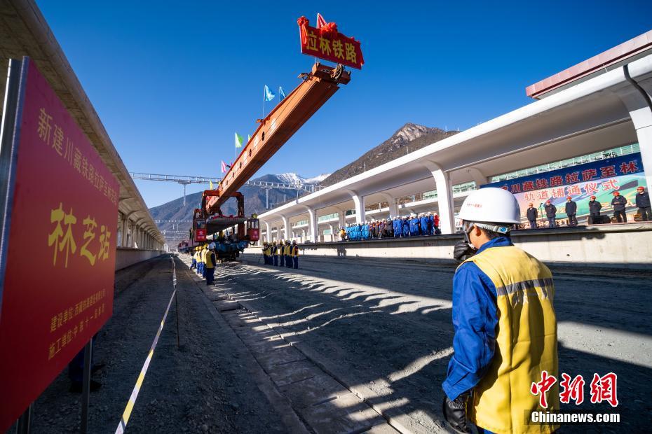 12月31日,拉林鐵路最后一段軌排鋪設(shè)現(xiàn)場。當日,在西藏林芝市尼洋河畔的新建林芝火車站,川藏鐵路拉薩至林芝段(拉林鐵路)最后一段軌排順利鋪設(shè),這標志著拉林鐵路399.61公里的正線軌道全部鋪通,西藏東南地區(qū)結(jié)束無鐵路歷史。拉林鐵路起自西藏自治區(qū)首府拉薩,終點為林芝市,正線全長435.5公里,新建正線403.1公里,系西藏首條電氣化鐵路,設(shè)計行車速度為160km/h,全線計劃于2021年6月30日建成通車。中新社記者 何蓬磊 攝