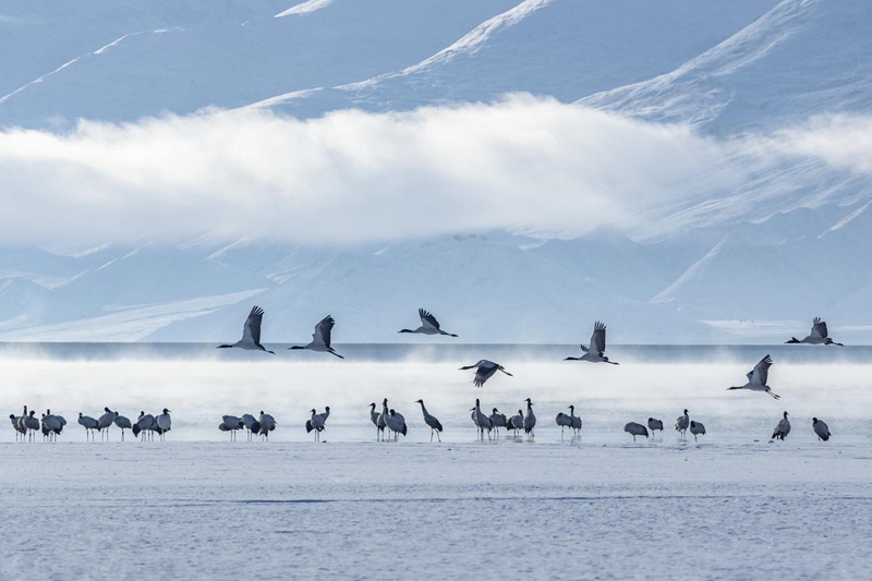 見過銀裝素裹的拉薩,但你一定沒見過在漫天白雪中盡情飛舞的黑頸鶴。茫茫天地間,優(yōu)雅的黑頸鶴沐浴著陽光,直沖云霄。時值3月,在拉薩林周悠閑越過一冬的黑頸鶴,即將北上,開始新一季的遷徙。這春雪,仿佛就是送給它的離別禮物。