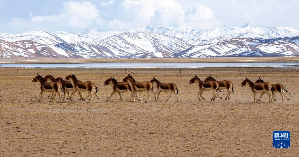4月22日,藏野驢在西藏阿里地區(qū)普蘭縣境內(nèi)雪山下活動。新華社發(fā)(劉曉東攝)