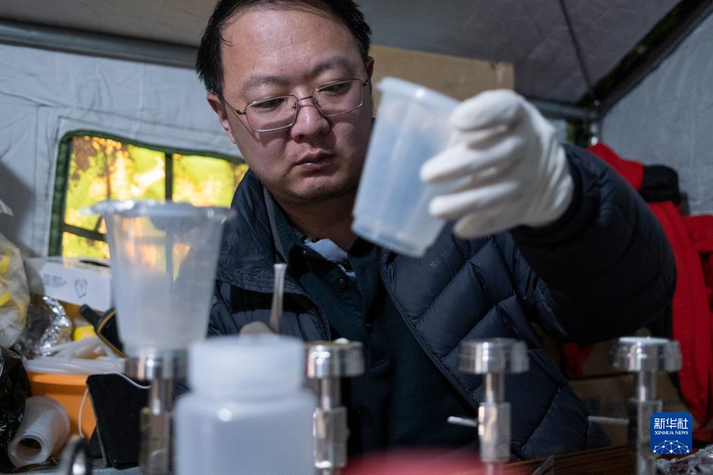 在珠峰登山大本營,科研人員提取冰川融水里的微生物(4月30日攝)。新華社記者 孫非 攝
