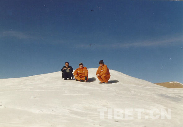 圖為2004年12月20日,劉爭平(中)和同事在唐古拉山。