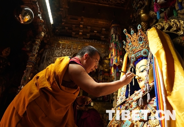十一世班禪為釋迦牟尼十二歲等身佛像面部涂繪金粉。攝影:王淑