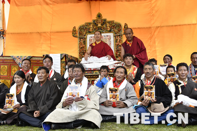 從馬上下來后,十一世班禪為早已等候在此的信眾摸頂賜福。信眾還得到了十一世班禪的畫像、像章以及紅色金剛結(jié)。
