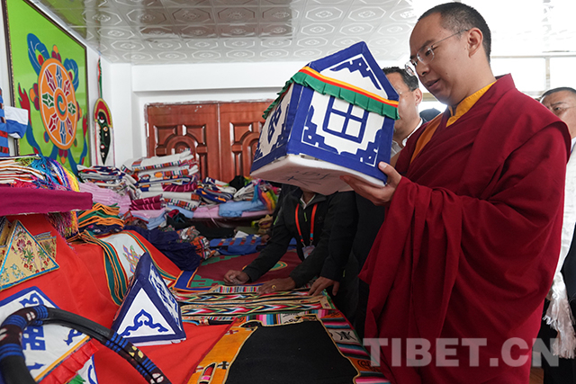 十一世班禪仔細觀看學(xué)校殘疾人職業(yè)教育中心里的作品。攝影:王淑