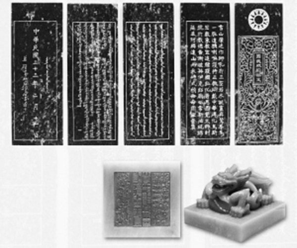 謝國(guó)梁奔波于藏事,為中央政府與西藏地方關(guān)系的恢復(fù)發(fā)揮了橋梁作用。圖為第十三世達(dá)賴(lài)?yán)飯A寂后,國(guó)民政府追贈(zèng)其為“護(hù)國(guó)弘化普慈圓覺(jué)大師”的稱(chēng)號(hào),并頒發(fā)玉冊(cè)、玉印。圖片來(lái)源:人民網(wǎng)—西藏頻道。