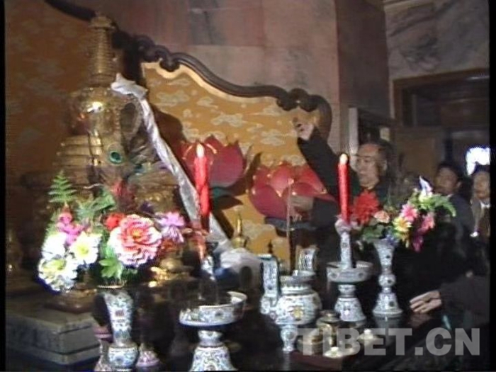 圖為1987年4月,十世班禪大師和阿沛?阿旺晉美率領(lǐng)援助西藏發(fā)展基金會(huì)籌備委員會(huì)委員朝拜靈光寺佛牙舍利塔,并親自敬獻(xiàn)哈達(dá)。