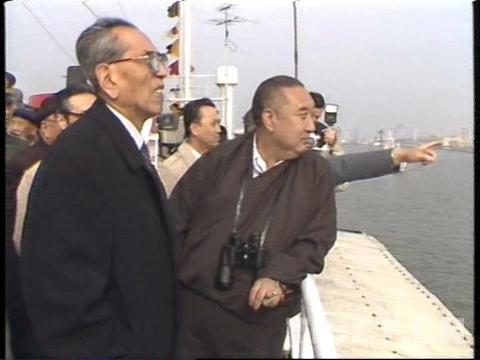 圖為1987年4月19日,十世班禪大師和阿沛?阿旺晉美率領(lǐng)援助西藏發(fā)展基金會(huì)籌備委員會(huì)委員考察天津港。