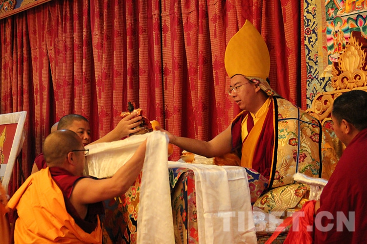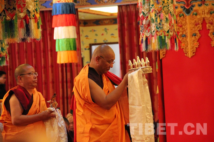 圖為土多申格副院長帶領經(jīng)師代表和學員代表,虔誠地向十一世班禪敬獻曼扎、佛像、佛塔、佛經(jīng)。攝影:孫健