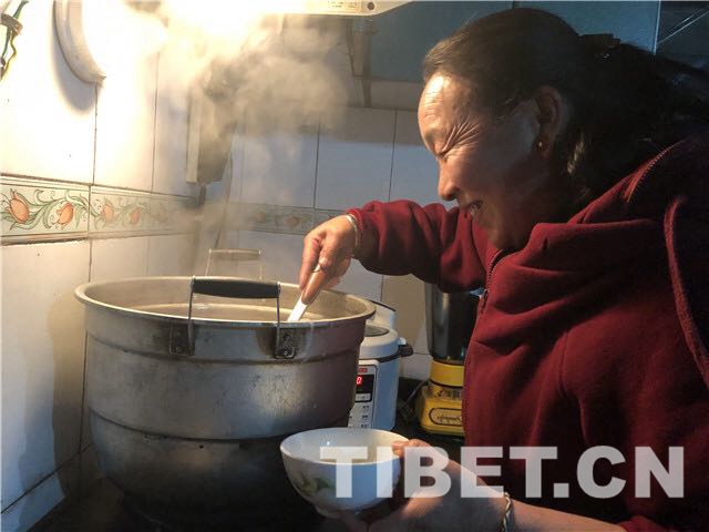 當(dāng)晚,西藏拉薩市阿壩林卡社區(qū)的索朗旺堆老人一家聚在一起,一起品嘗了寓意十足的“古突”。