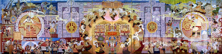 壁畫左面主體為手舉火把辭舊的西藏牧區(qū)婦女,她的四周環(huán)繞著吃古突、沐浴、背水、鳴槍、拋五谷、彈六弦、熱巴舞等活動場面,以及手捧果實的門巴族、珞巴族人物。
