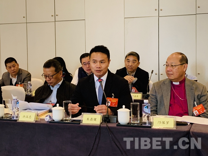 圖為第十三屆全國政協(xié)港澳臺(tái)僑委員朱鼎健在小組會(huì)上發(fā)言