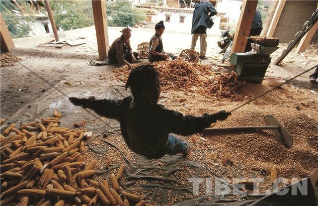 十月的鹽井正是收獲的季節(jié),金燦燦的玉米和圓潤(rùn)飽滿的核桃鋪滿了每家每戶的房頂,樹(shù)上的水果吃不及,石榴、蘋果和梨掉了一地,路邊的小孩人手一支彈弓——用來(lái)打樹(shù)上的果子吃。動(dòng)作慢的人家還在地里收割玉米、搶先一步的人家已經(jīng)在將曬干的玉米放進(jìn)脫粒機(jī)了,而運(yùn)核桃的汽車、馬幫則已經(jīng)上路。農(nóng)忙中的鹽井一派熱鬧歡騰景象。