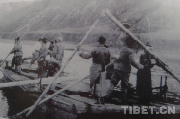 圖為1950年7月,154團(tuán)在金沙江上造的第一艘能載汽車的大木船。