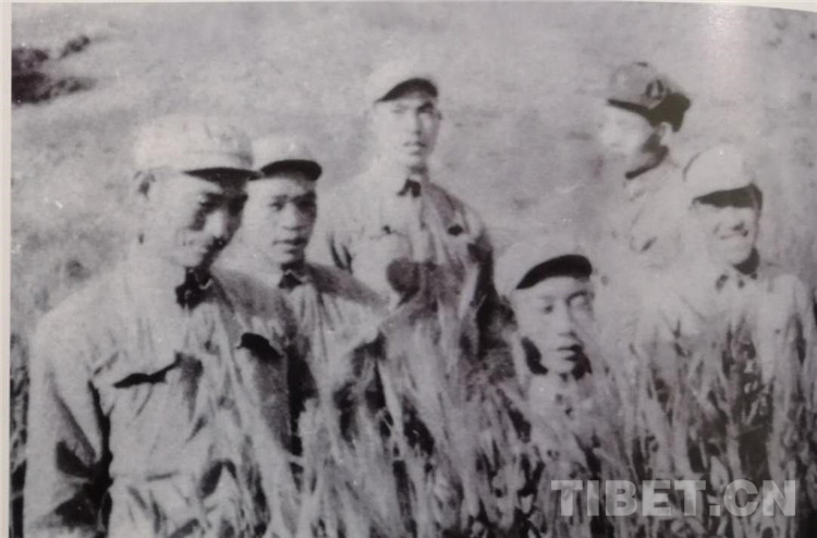 圖為1951年8月,先遣154團(tuán)在生產(chǎn)基地的青稞地里分享豐收的喜悅。左起保衛(wèi)股長(zhǎng)洪振寰、技術(shù)書(shū)記胡翼程、副正教孫從善、楊軍、郄晉武、見(jiàn)習(xí)干事殷繼凡。