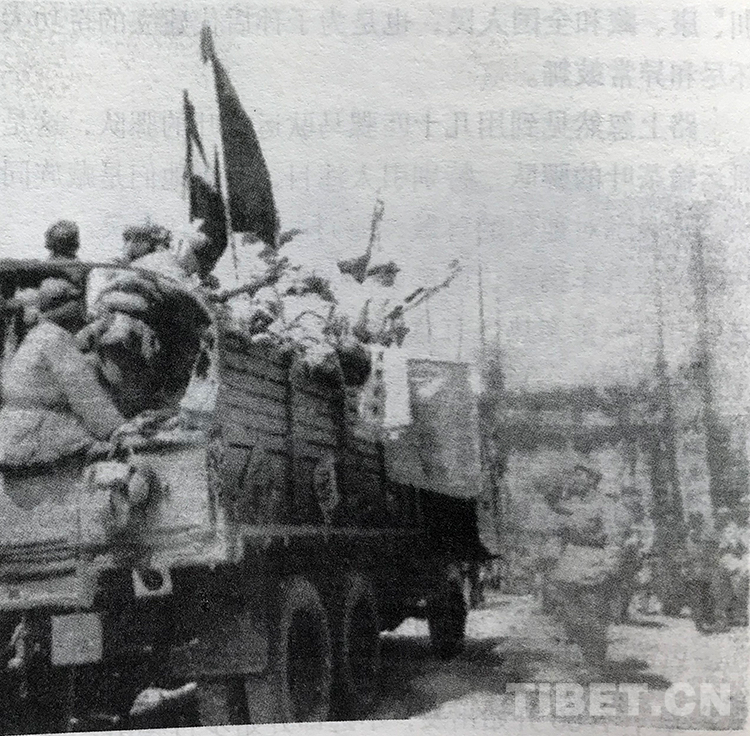 魏克在日記中寫道:“滿載著進(jìn)軍英雄們的車隊,被沿途歡送的人群包圍起來了,許多青年男女跑上來,在汽車上貼滿了紅綠標(biāo)語,送上一碗碗茶水,將一把把香煙撒在車廂上,鮮花、紙花、小旗子插滿了車的四周?!D銈兤扉_得勝,馬到成功’和‘迅速解放西藏人民’的口號聲此起彼伏、響徹云霄。汽車慢慢地從一個個彩門下通過,被歡呼的群眾送了一程又一程?!?/p>