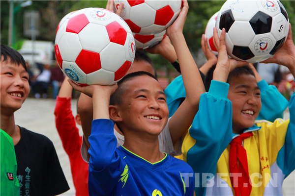 圖為香格里拉市金江鎮(zhèn)小學(xué)孩子拿到“愛(ài)心足球”