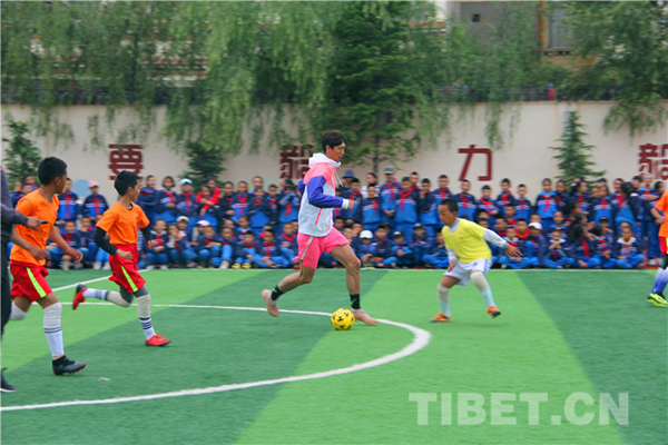 圖為許湛帶紅旗小學(xué)孩子們踢比賽