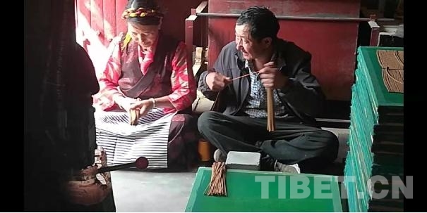 次仁多杰老人的弟弟和女主人正在捆藏香