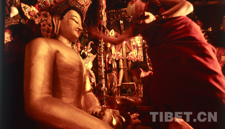 藏族朋友們認為,刷金不僅能給佛像增加神圣莊嚴的氣氛,更能使觀看者生恭敬清凈的心,為佛像刷金、尤其是為釋迦牟尼12歲等身像刷金的功德是非常巨大的。