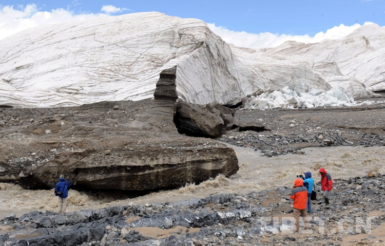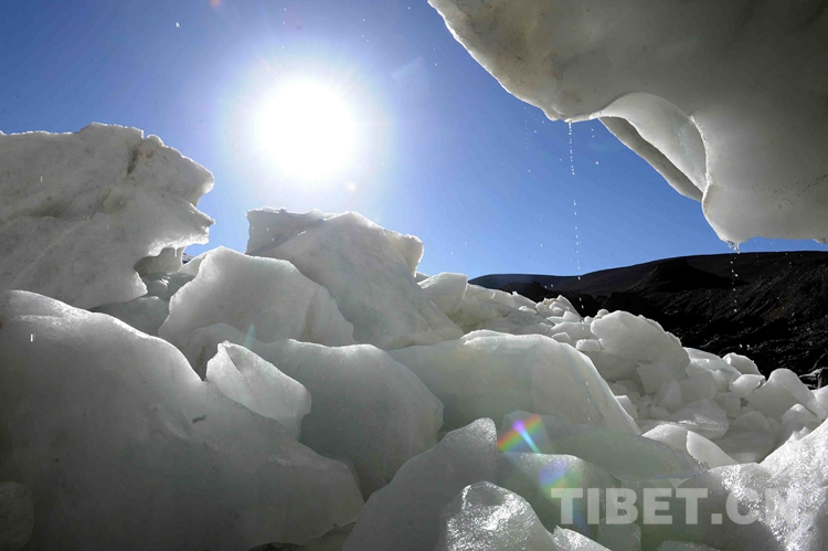 當(dāng)然,受全球氣候變暖的影響,近年來普若崗日冰原的融水痕跡也很明顯,冰原外圍冰體常見掛滿融水的冰凌;也常見正在融化、殘留地面的許多冰塊及那些從冰川下裸露出的大大小小的石頭。