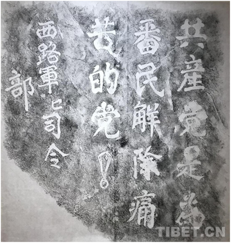 紅軍長(zhǎng)征在藏區(qū)留下了諸多遺跡,展覽中的《黑水縣沙石多鄉(xiāng)紅軍標(biāo)語(yǔ)》(1935年)便是其中一處。據(jù)歷史記載,1935年7月至1936年8月,紅一、四方面軍先后三次駐扎或經(jīng)過四川,黑水(今四川省阿壩藏族羌族自治州黑水縣)藏族群眾曾幫助紅軍熬鹽、籌糧,籌措物資。拓片中赫然醒目的標(biāo)語(yǔ)見證了這一段歷史:“共產(chǎn)黨是為番民解除痛苦的黨!”