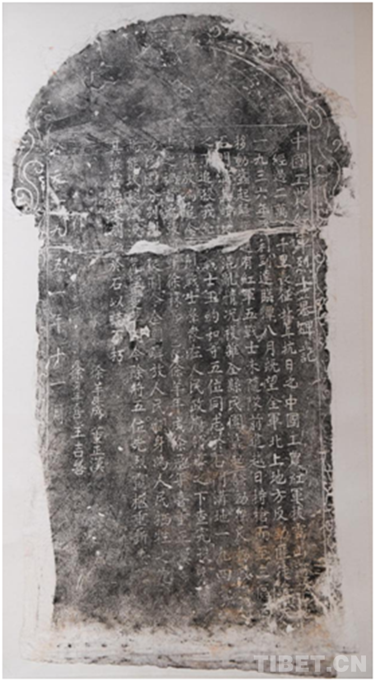 展覽中還有一幅與紅軍過雪域有關(guān)的展品——《中國(guó)工農(nóng)紅軍烈士墓碑》(1951年)拓片。碑文記錄了這樣一段歷史:1936年,中國(guó)工農(nóng)紅軍長(zhǎng)征北上抗日到達(dá)臨潭(今甘肅省甘南藏族自治州臨潭縣)時(shí),紅軍戰(zhàn)士王約如等5位戰(zhàn)士在石門溝犧牲。1949年,這5位戰(zhàn)士被追念為先烈戰(zhàn)士,人民政府查究?jī)词郑匦掳苍崃擞⒘覒?zhàn)士靈柩。