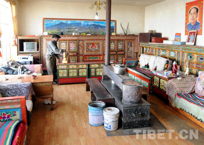 走進(jìn)日瑪家大院,屋外是一個保暖的玻璃陽光棚。再走進(jìn)屋內(nèi),里面是個大房間。窗戶上掛著淡雅的黃、白兩色窗簾,房子正中是燒牛羊糞的大鐵皮爐,靠墻邊是畫著小鳥、花卉的大藏柜,上面擺放著電視機(jī)、電話、收錄機(jī)、磁帶、藥箱等。兩面墻壁邊擺放著冰柜、沙發(fā)和鋪著艷麗藏毯的木床及電動奶油分離器、高壓鍋等物品,屋頂上掛著花瓣式大吊燈。