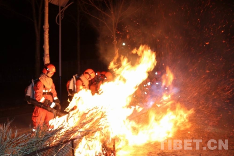 中國西藏網(wǎng)訊 12月17日晚,西藏自治區(qū)昌都市森林消防支隊左貢中隊展開了一場夜間實戰(zhàn)訓(xùn)練,場面火熱。圖為實戰(zhàn)訓(xùn)練中消防員們互相配合,撲打火線。