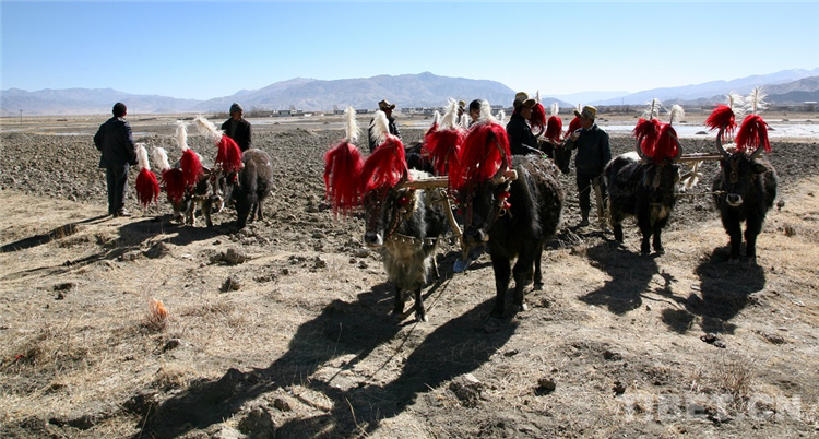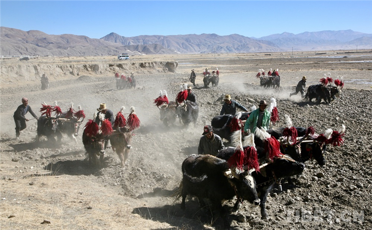 圖為日喀則的開耕節(jié),農(nóng)民們在進行二牛抬杠犁地比賽