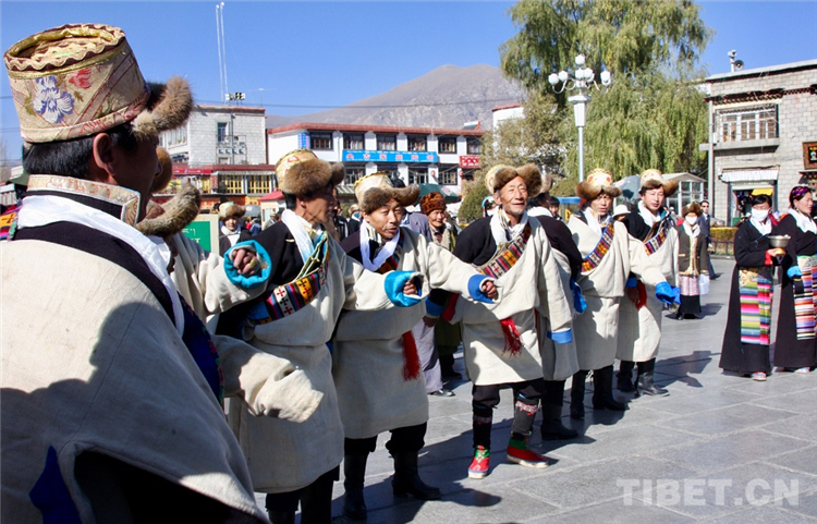 圖為藏歷新年期間,拉薩郊區(qū)的民眾邀約至大昭寺廣場歡歌悅舞。