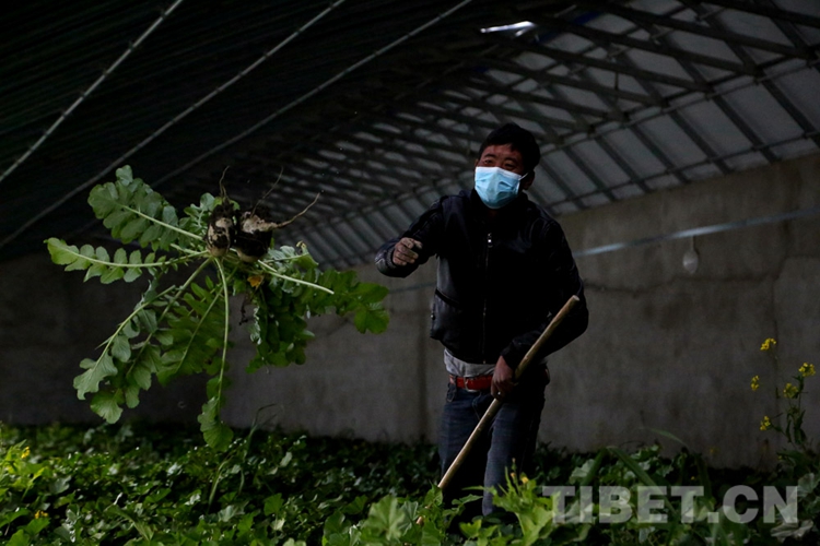 圖為瓊結(jié)縣相達(dá)村村民正在溫室大棚里采摘蘿卜 攝影:倫珠澤仁