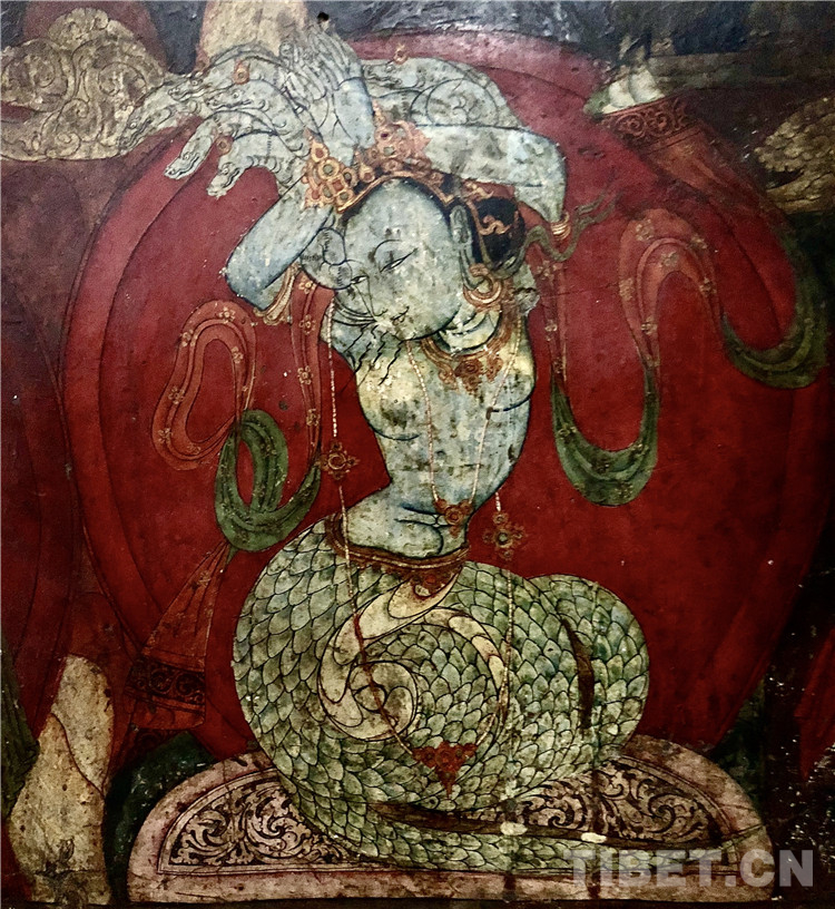 追溯其源頭,在阿里的巖畫(huà)中曾經(jīng)有不少龍神崇拜的母題,苯教經(jīng)典《十萬(wàn)龍經(jīng)》亦有記載龍母創(chuàng)生萬(wàn)物的神話。所以,有學(xué)者將這類人獸結(jié)合的龍女形象,看作是苯教母題下古格造像藝術(shù)的產(chǎn)物。