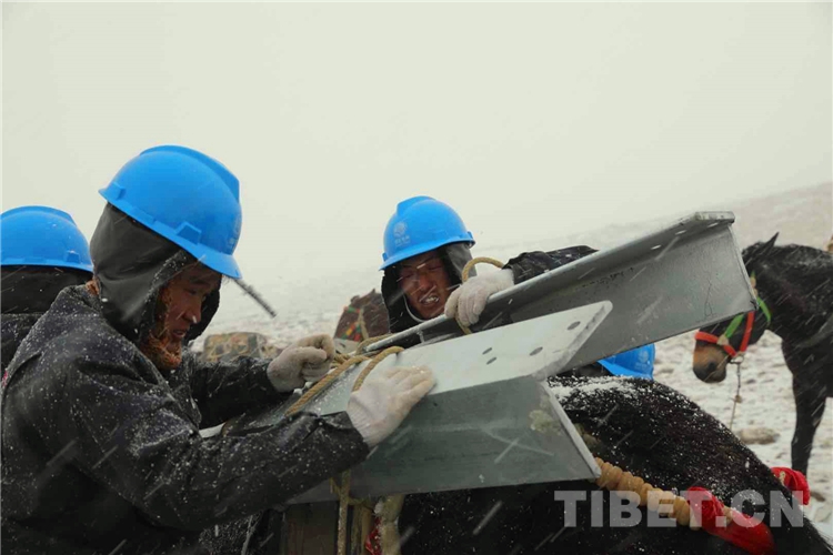 加上山脊上都是尖石頭,馬蹄子上粘了雪,走路也開(kāi)始變滑。眼看著不遠(yuǎn)的運(yùn)輸距離,其他塔位半個(gè)小時(shí)能運(yùn)輸一趟,在風(fēng)雪里,又在5357米海拔高的地方,變成了一個(gè)半小時(shí)一趟。此時(shí)4R053號(hào)塔位氣溫已經(jīng)降到零下25度,風(fēng)速已經(jīng)達(dá)到8級(jí),人在風(fēng)雪里已經(jīng)站不住了,更不要說(shuō)是負(fù)重的馬匹?!靶值軅円а缊?jiān)持住,這一趟運(yùn)輸必須完成,呆久了馬兒要受不了了,馱完這一趟,我們就往山下撤?!鄙辰鹑A在風(fēng)雪里大聲地吼道。