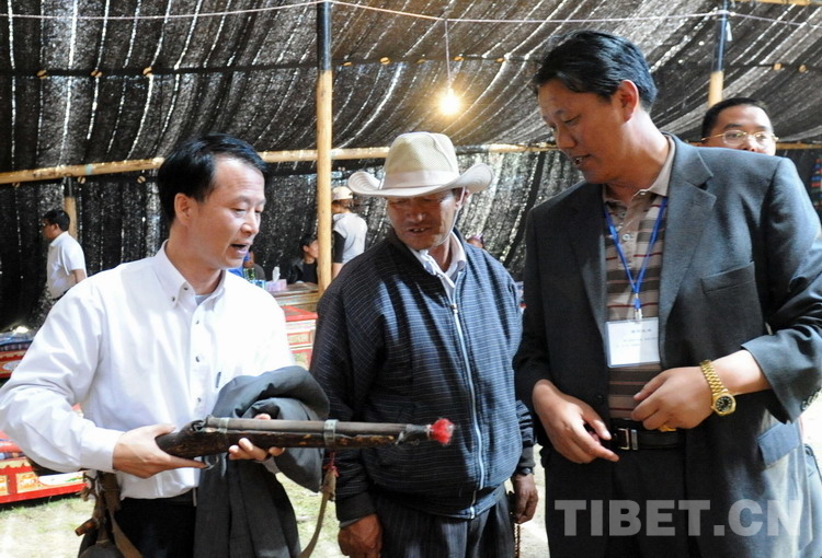 這是時(shí)任那曲縣縣長扎南(右)與中石化首批援藏干部李一超(左)在那曲賽馬會(huì)的大“黑賬”里,正在交流牧民傳統(tǒng)火槍的使用方法(唐召明2009年8月12日攝)
