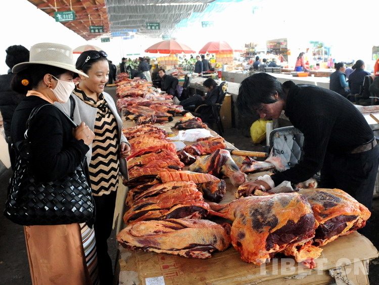 這是在那曲鎮(zhèn)綜合市場(chǎng),許多牧民群眾乘坐客運(yùn)班車來(lái)這里銷售剛宰殺的牛羊肉(唐召明2012年8月6日攝)