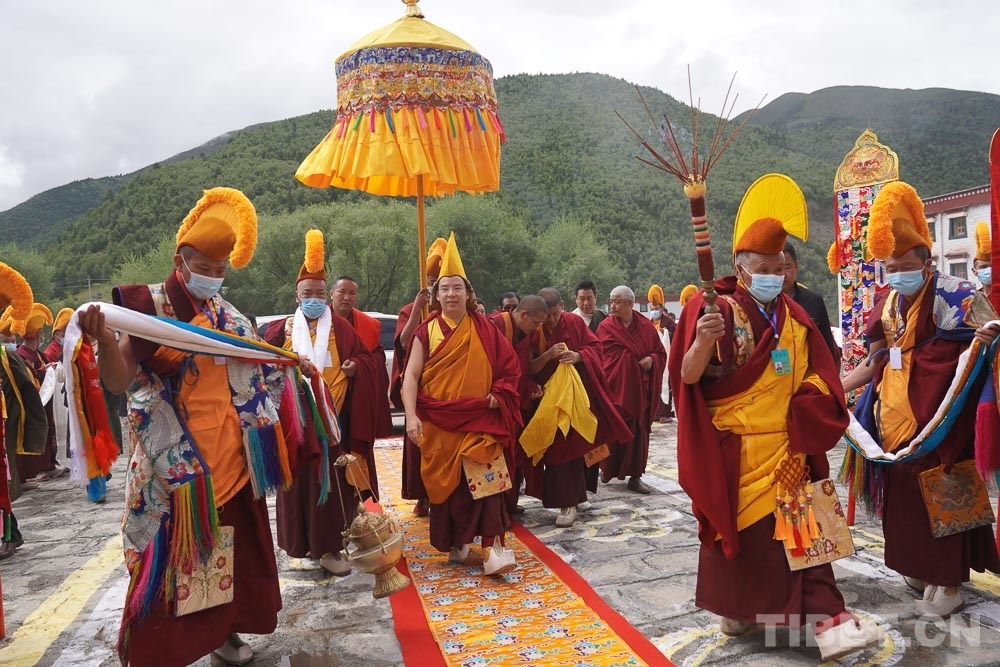 同樣期盼著十一世班禪到來的還有巴青縣苯教寺院巴倉寺央旦桑布等眾僧。8月22日,十一世班禪參訪巴倉寺了解寺院歷史文化,登上杜康殿寶座并為僧眾摸頂。