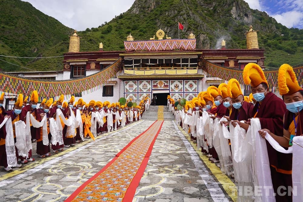 青山之下,桑煙裊裊、法號(hào)長(zhǎng)鳴的那曲市索縣榮布熱登寺迎來了十一世班禪。8月23日,在200余名僧眾的期盼中,十一世班禪在杜康殿為寺院僧眾摸頂、傳經(jīng)。