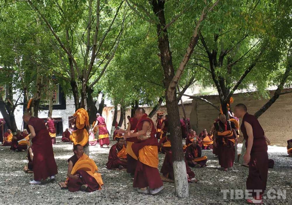 圖為榮布熱登寺內(nèi)正在辯經(jīng)的僧眾 攝影:春拉