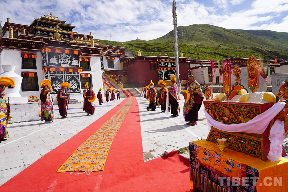 為了迎接十一世班禪的到來,索縣贊丹寺也早早地做好了準(zhǔn)備。贊丹寺是藏北地區(qū)最早的格魯派寺院,修建在雅拉多山頂上,外形酷似布達(dá)拉宮。寺內(nèi)珍藏大量的佛像、壁畫、藏經(jīng)印冊(cè)等,具有很高的文物和藝術(shù)價(jià)值。8月21日,在寺廟僧眾的誦經(jīng)聲中,十一世班禪登上措欽大殿寶座為僧眾摸頂賜福,傳授《達(dá)妥瑪開光儀軌》《上師供儀軌》《時(shí)輪金剛祈愿文》。